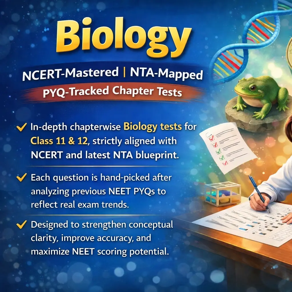In-depth chapterwise Biology tests for Class 11 & 12, strictly aligned with NCERT and latest NTA blueprint. Each question is hand-picked after analyzing previous NEET PYQs to reflect real exam trends. Designed to strengthen conceptual clarity, improve accuracy, and maximize NEET scoring potential.