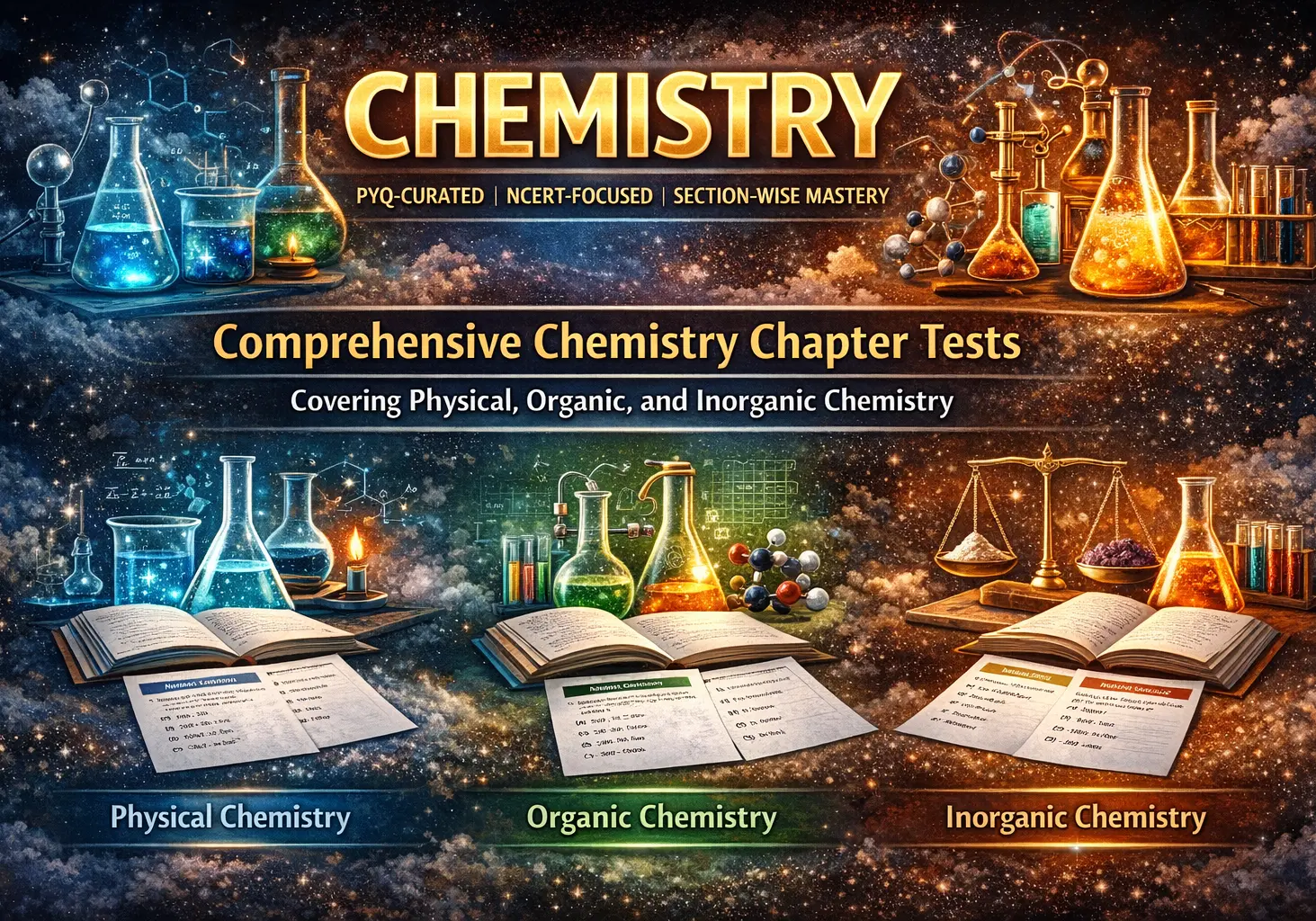 Comprehensive Chemistry chapter tests covering Physical, Organic, and Inorganic Chemistry. Each set is crafted using NTA trends and past NEET questions to ensure NCERT accuracy, reaction logic clarity, and formula application mastery.